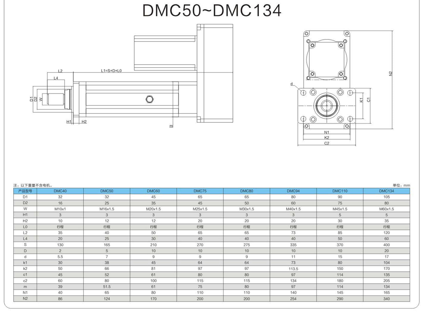 丝杆,再将丝杆运动转换为推杆的直线运动。产品结构紧凑,尺寸小,噪音低;刚性好,承载力更大;可精确的控制位置和速度实现高速平稳的运行,可很好代替气缸。本系列规格齐全,可做多重结构和电机安装方式,包含DMC40,DMC50,DMC60,DMC75,DMC80,DMC94,DMC110,DMC120,DMC135,DMC150,DMC180,DMC220系列。