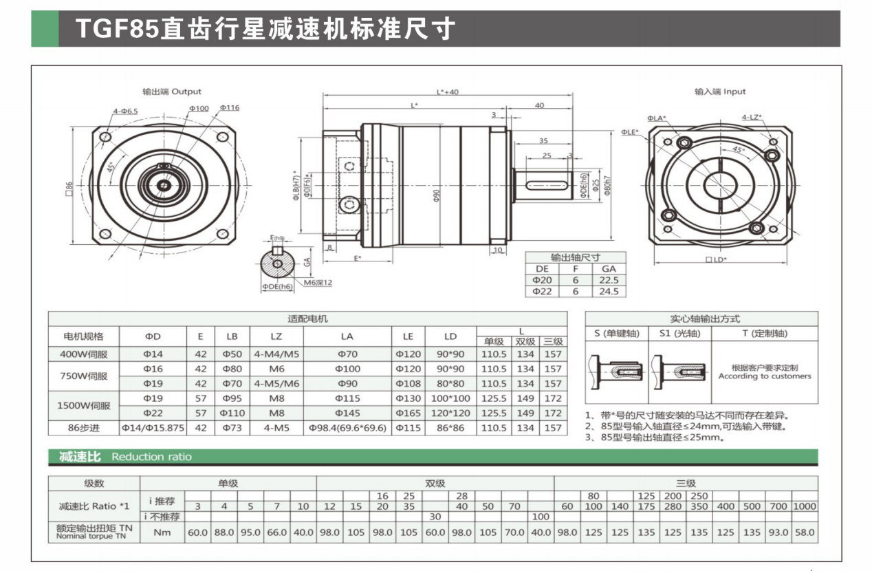 此系列减速机采用直齿齿轮传动,经渗碳淬火处理,齿向齿廓修形处理,确保运行平稳,低噪音,低间隙、高输入转速、高扭矩、高效率。本系列产品包含TGF60,TGF85,TGF115,TGF160等规格。