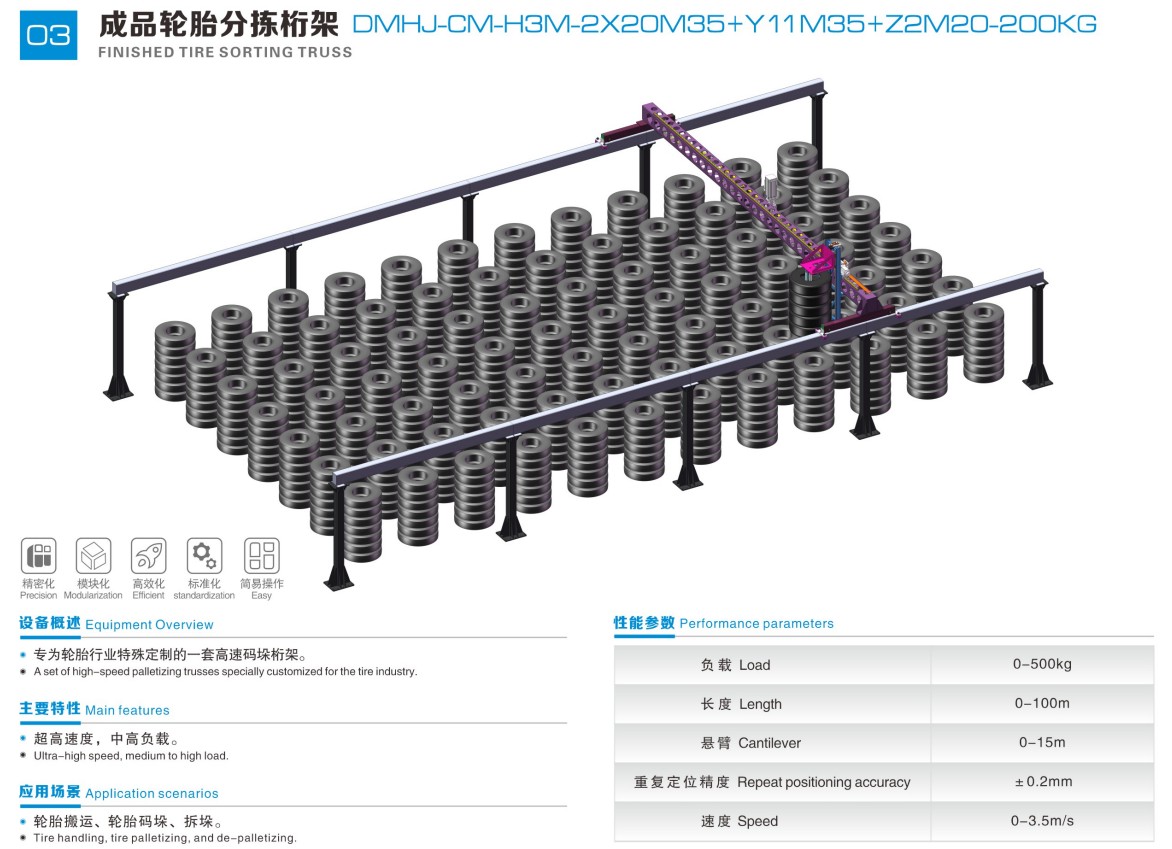 A high-speed palletizing gantry specially customized for the tire industry.